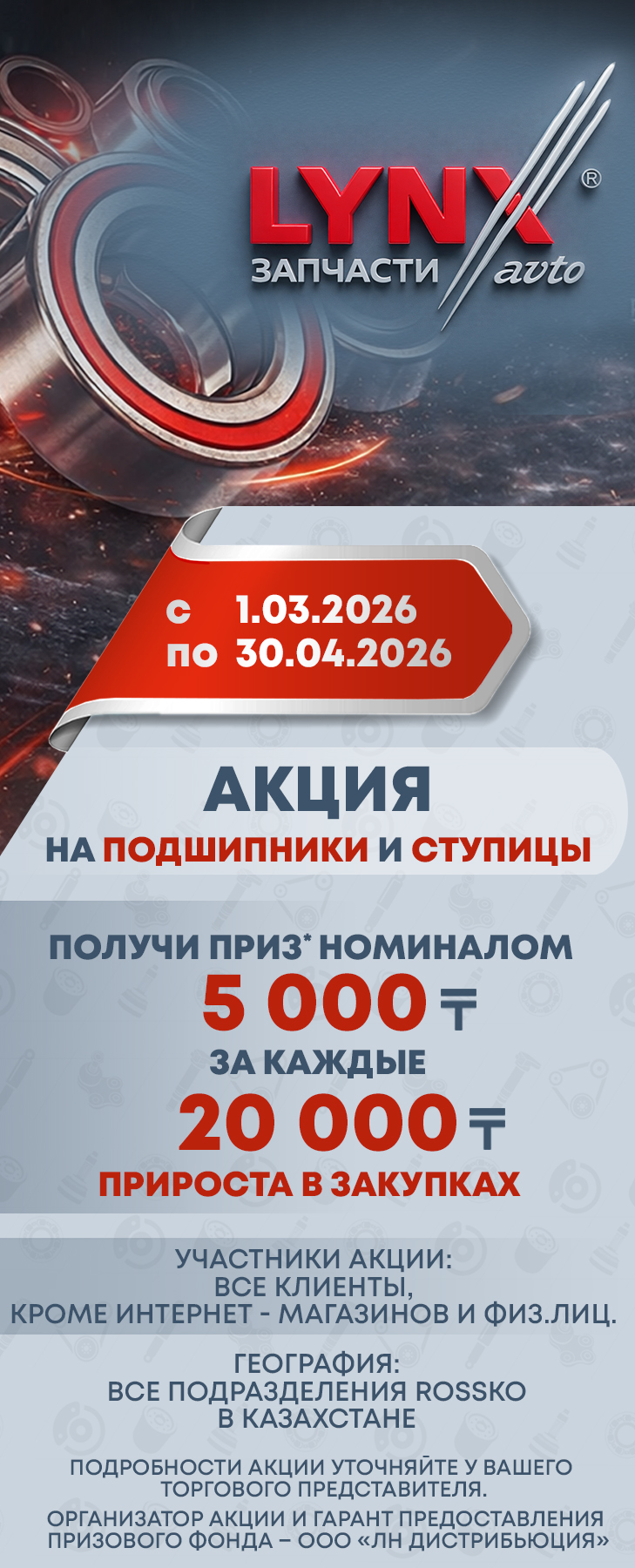 01.03 - 30.04.2026 Акция "Приз* 5 000 ₸ электронными сертфикатами за каждые 20 000 ₸ прироста на продукции ЛИНКСАВТО (LYNXauto) в категории ПОДШИПНИКИ И СТУПИЦЫ"